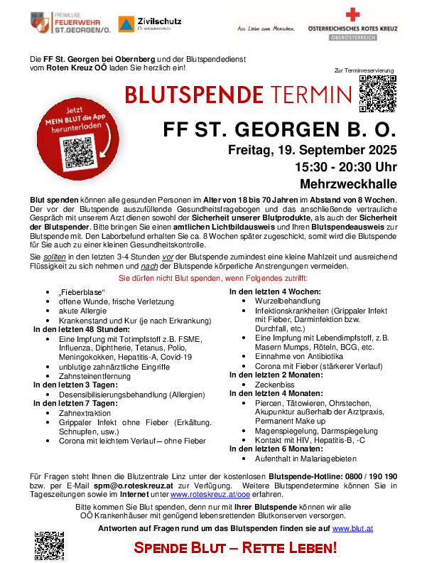 Bitte bringt einen amtlichen Lichtbildausweis mit – und am besten gleich euer Smartphone! Mit der neuen App „Mein Blut“ vom Roten Kreuz wird das Spenden noch einfacher: Gesundheitsfragebogen vorab digital ausfüllen, Termine finden und später Laborbefunde direkt einsehen. Kostenlos erhältlich im App Store oder Google Play – einfach „Mein Blut“ suchen, registrieren und verknüpfen.